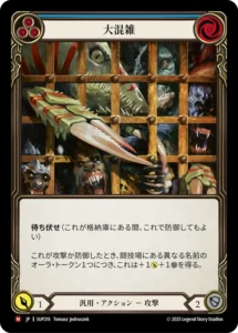 このチェインリンクで防御リアクションカードはプレイできない。 これがヒーローにヒットしたとき、そのヒーローの格納庫のカードをすべて破壊する。